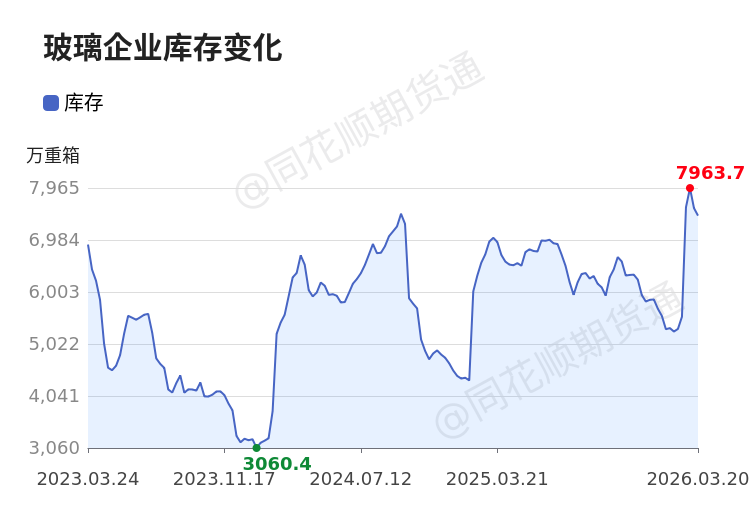 历史数据清楚,自2023年3月24日以来,玻璃企业库存最高为7963.70万重箱,最低为3060.40万重箱,库存均值录得5635.77万重箱,刻下库存(7443.60万重箱)较均值增多32.08%。