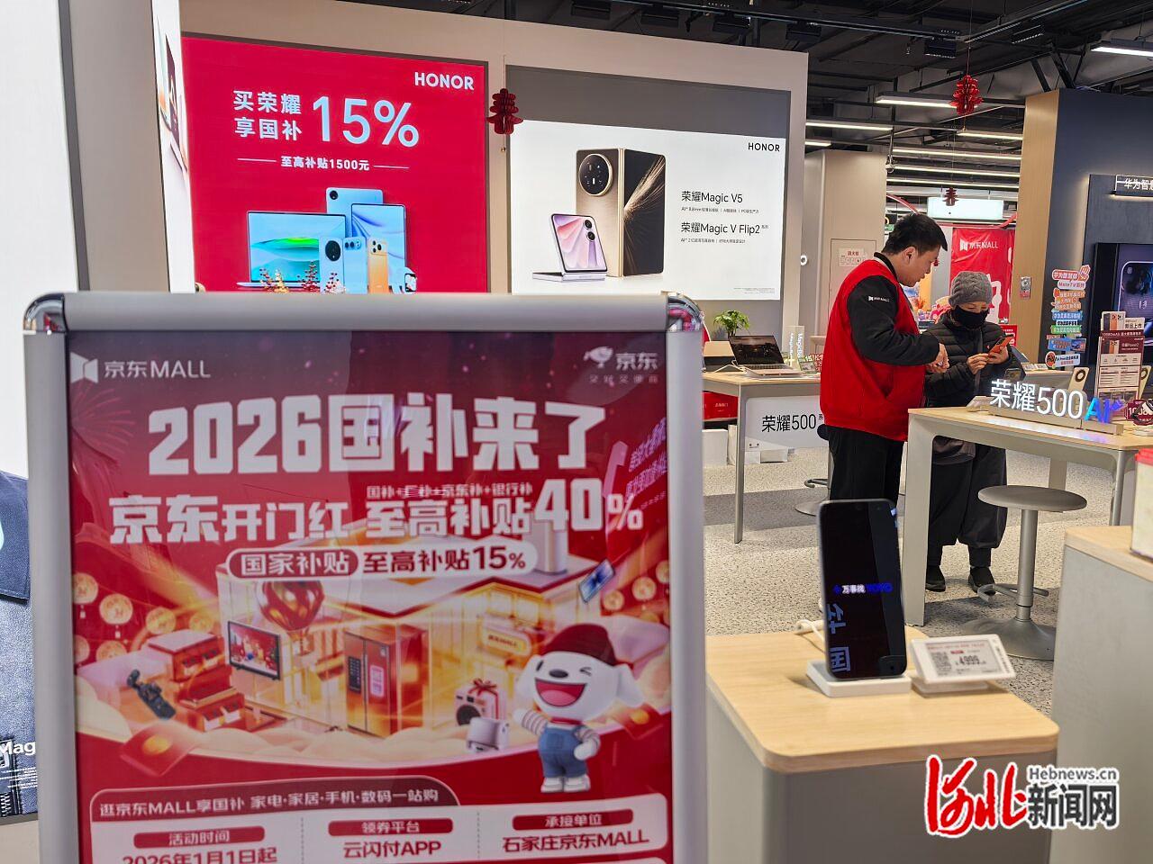 1月14日15时,走进京东MALL石家庄新华店,“2026国补来了”的宣传语遍地可见,消耗品以旧换新的营销氛围拉满。